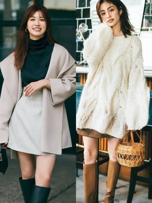体格优胜的女子最懂用衣物衬出盆骨,短大衣内搭玄色针织衫,与高腰短裙组合,脚上踩着一对玄色中筒靴,微露膝盖肌肤,灵动俏皮,下衣失散的穿法利落又显体格。