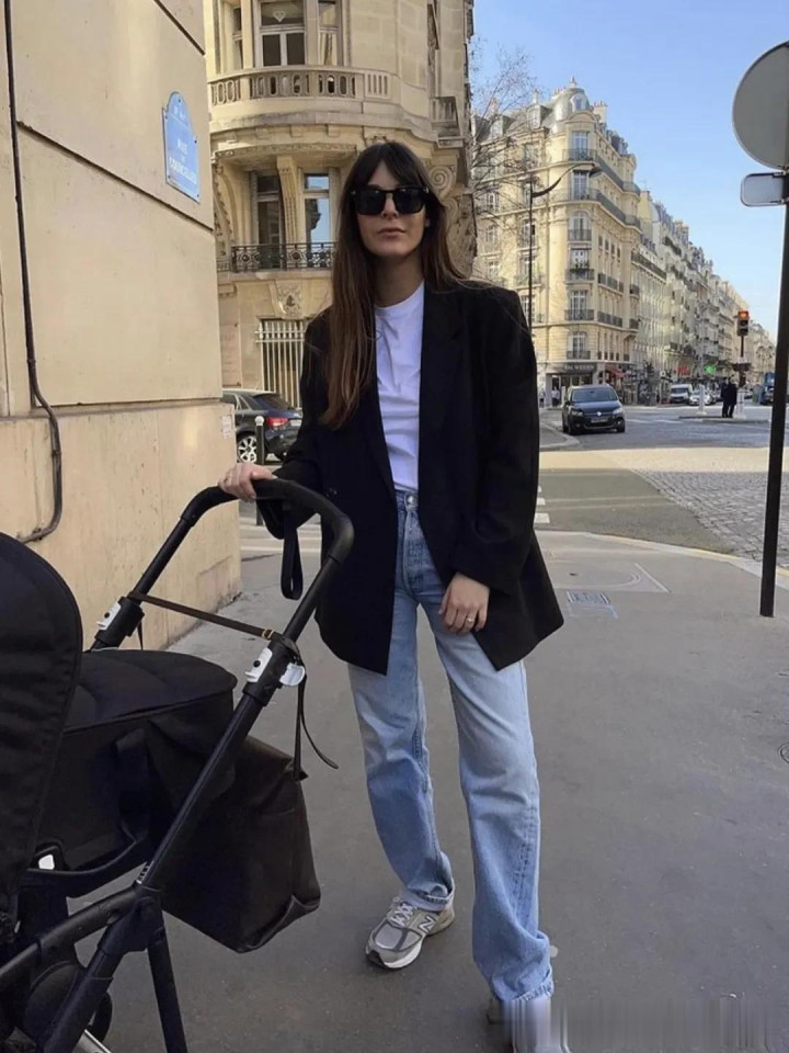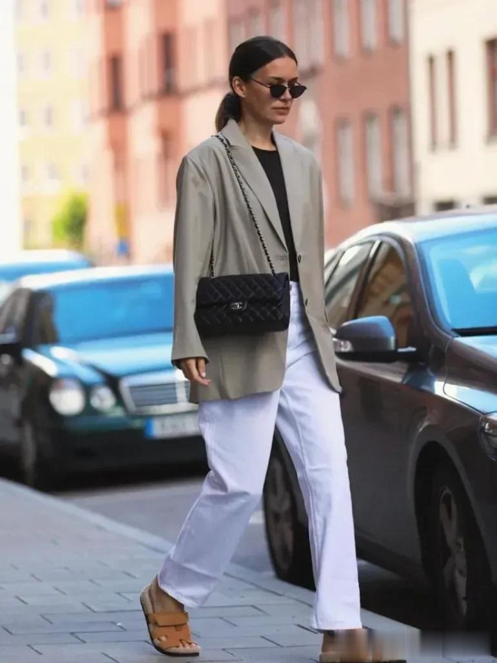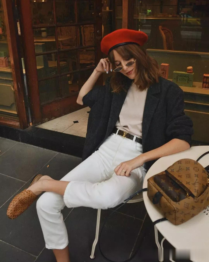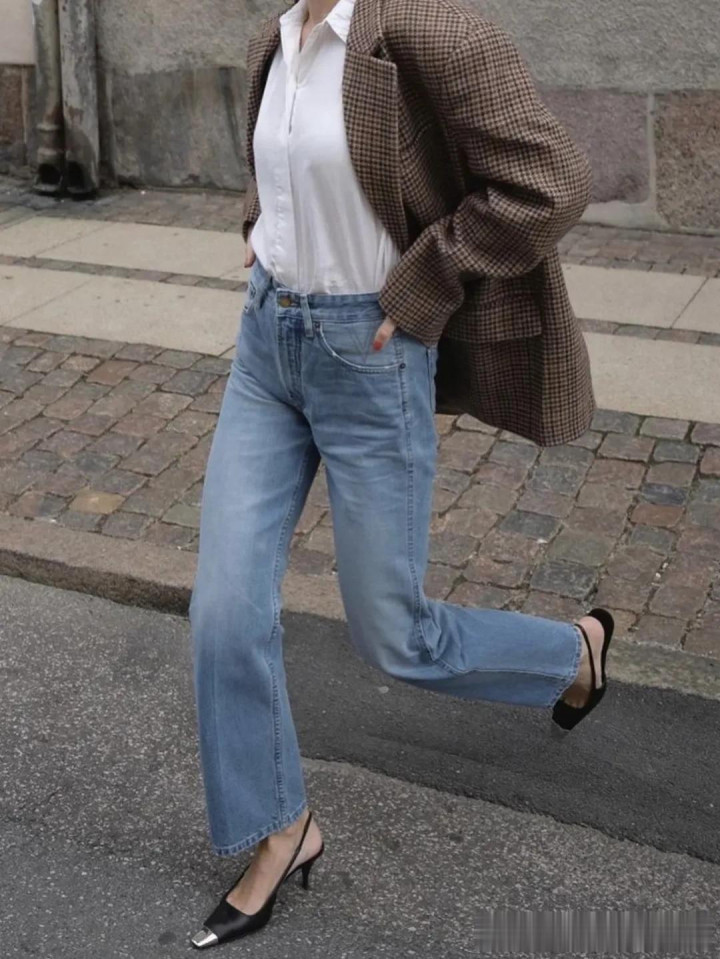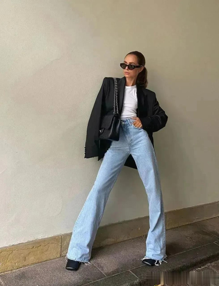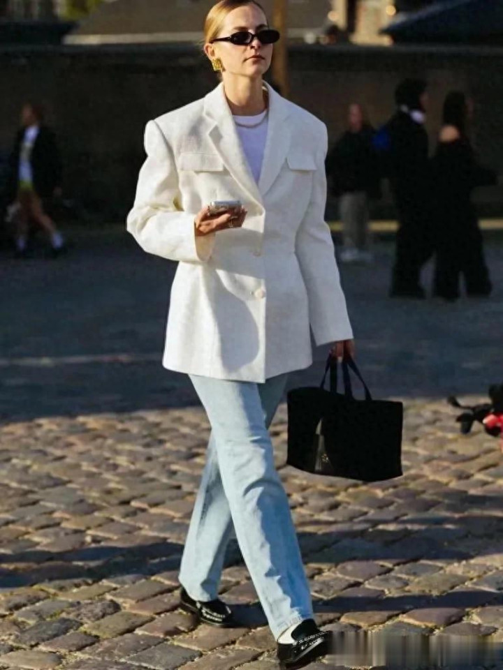 把稳:白色牛仔裤中庸玄色的照应,