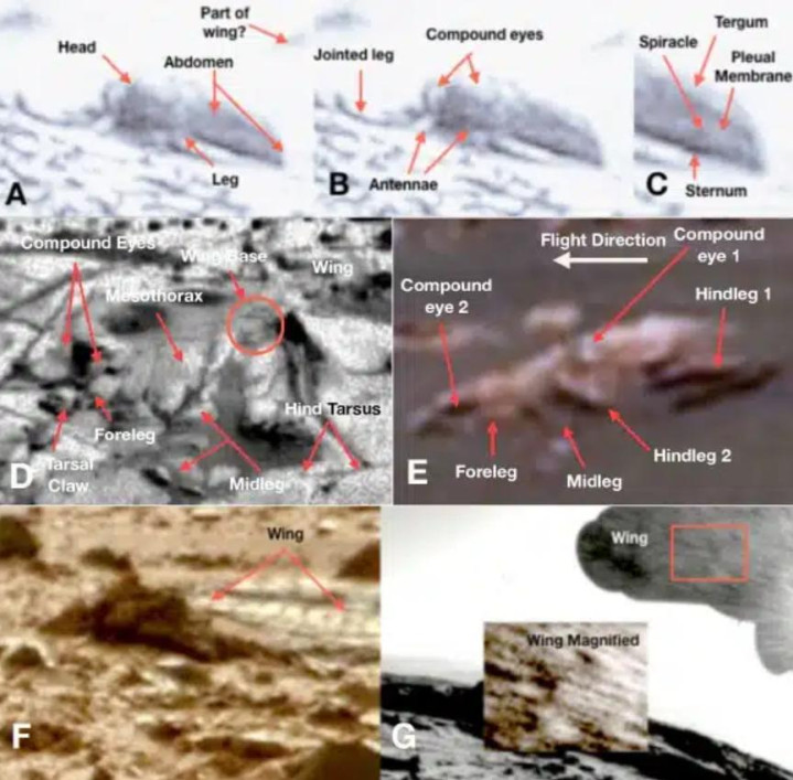 NASA探伤车图像披露火星上可能存在雷同虫豸的生物,标注有翅膀、胸部和腹部等特征。图片起头:威廉·罗莫泽