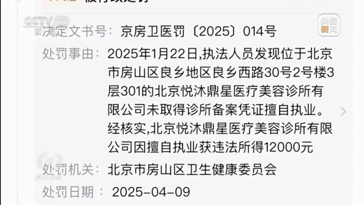随后,记者了解到,2024年、2025年北京市房山区卫健委先后两次因“未取得医疗机构持业许可证私行持业”以及“未取得诊所备案凭证私行持业”对这家公司赐与行政处罚。通过查询国度卫健委的有关网站发现,直到2026年1月,这家机构一直莫得取得医疗机构许可证以及进行有关备案。探望中记者还发现,这家店的位置是在一个比拟偏远街谈的二楼上,辞谢易被发现,那么主顾从何而来呢?内容上,这家医好意思店一般只继承熟谙东谈主保举的业务。