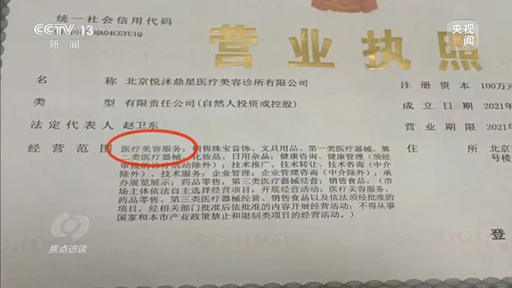 根据我国《医疗好意思容作事惩办见地》,任何单元和个东谈主未取得医疗机构许可证,不得开展医疗好意思容调扶养动。而这家医好意思机构大门口,挂着这家机构的营业牌照——悦沐鼎星医疗好意思容诊所公司,缱绻限度着实包含了医疗好意思容作事,但背面明确诠释,经有关部门批准后依批准的内容开展缱绻行径。关联词,机构厚爱东谈主一直莫得拿出正规医疗机构许可证。