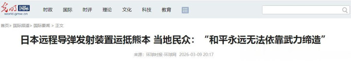 日本汉典导弹辐照安装运抵熊本 当地大师:“和平经久无法依靠武力缔造” 环球时报-环球网2026-03-09