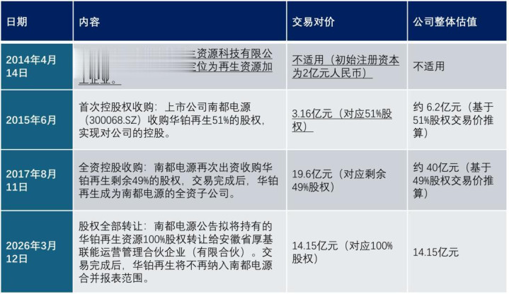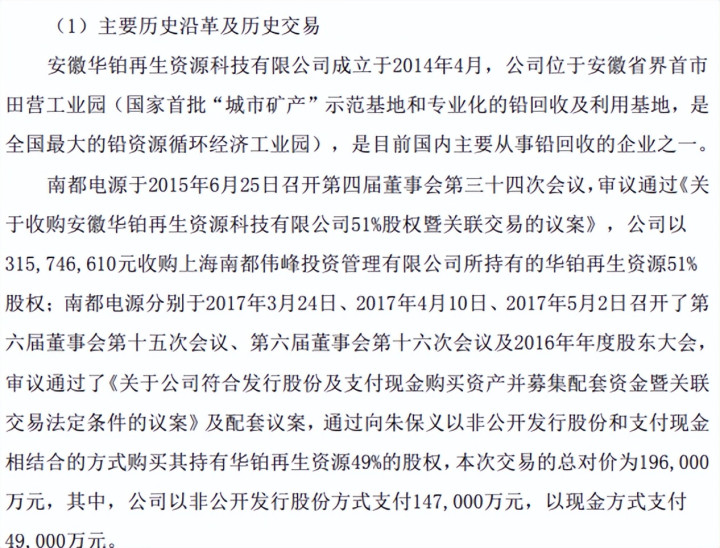 本年3月13日,南都电源发布公告称,拟以14.15亿元收购南都电源孙公司安徽华铂再生资源科技有限公司(以下简称:华铂再生)的全部股权。