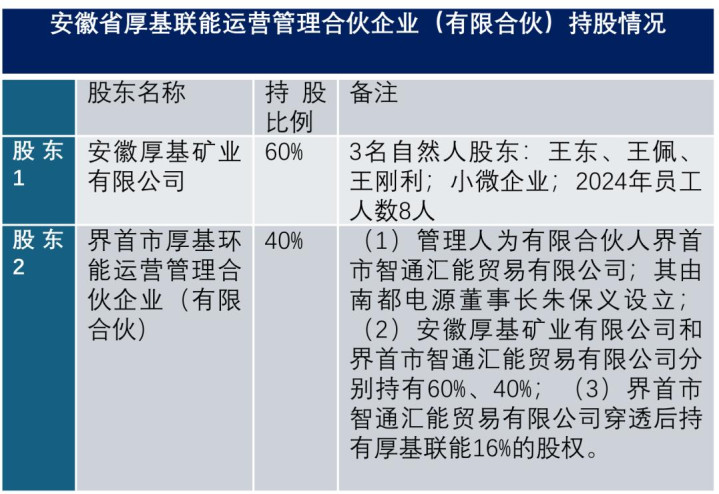 走动敌手方是安徽省厚基联能运营束缚合伙企业(有限合伙),其建造于2026年1月14日,安徽厚基矿业有限公司握股60%,界首市厚基环能运营束缚合伙企业(有限合伙)握股40%。