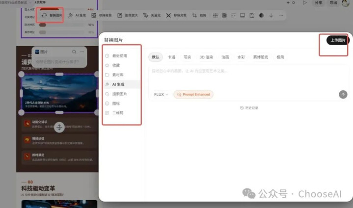Seede AI也提供图片素材,当你不酣畅某张图片又懒得土产货上传时,你可以选中它再选拔“替换图片”,从它的素材库中查找,也可以AI生成替换原有图片。