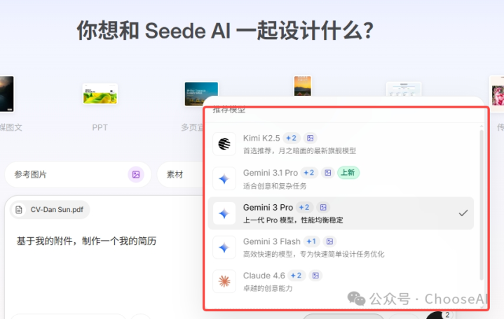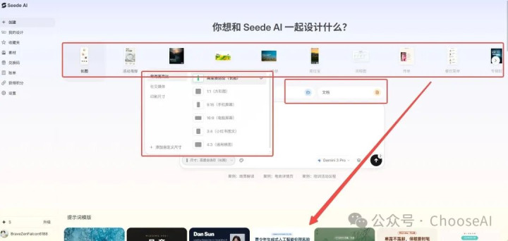 Seede AI输入功能永诀很细,可以上传参考图、素材、文档,也可以笔据不同物料选拔对应尺寸和模板。