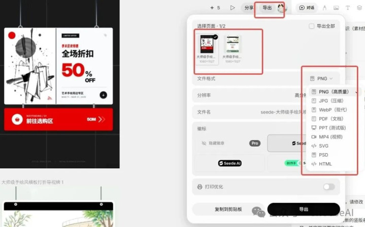 要是说在线裁剪是seede AI的精髓,那么导出方式则是它的王炸。