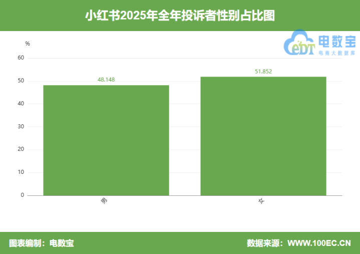 把柄网经社旗下电商大数据库“电数宝”露馅,投诉“小红书”男性用户投诉比例为48.148%,女性用户投诉比例为51.852%。