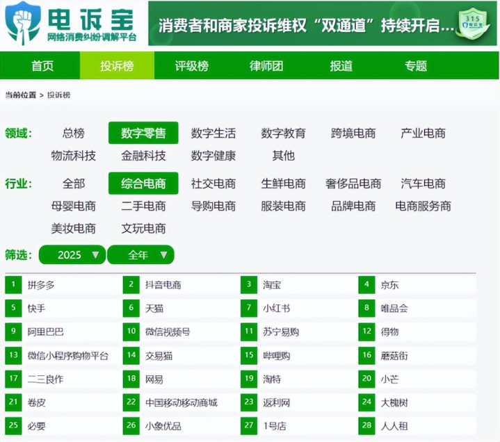 在“2025年概括电商投诉榜”中,上榜平台有28家: