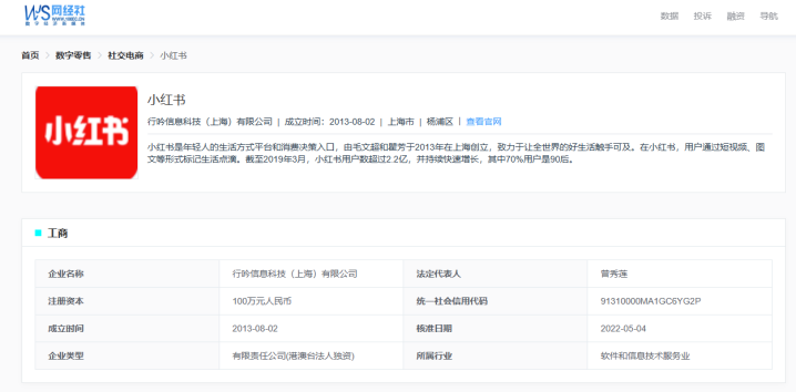 据网经社企业库露馅,小红书附庸于行吟信息科技(上海)有限公司,诞生于2013年8月2日,注册地址为上海市杨浦区,法定代表东谈主曾秀莲。