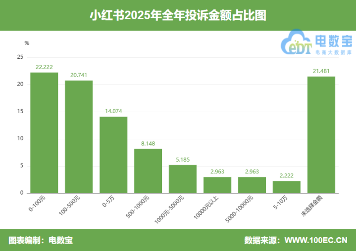 用户投诉“小红书”的破坏金额主要在0-100元、100-500元、0-5万、500-1000元、1000-5000元、10000元以上、5000-10000元、5-10万元区间。