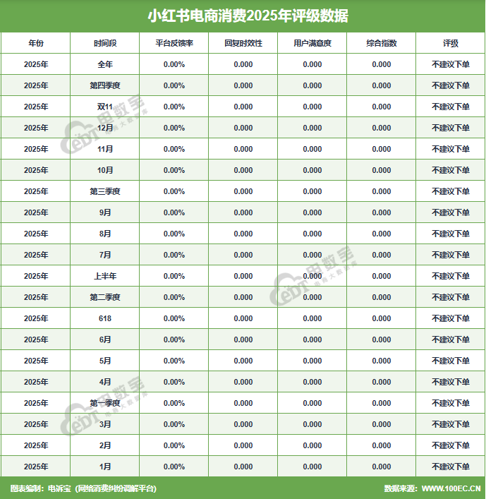 据网经社旗下电商大数据库“电数宝”监测数据露馅,2025年“小红书”共得到20次破坏评级,均为“不建议下单”评级。