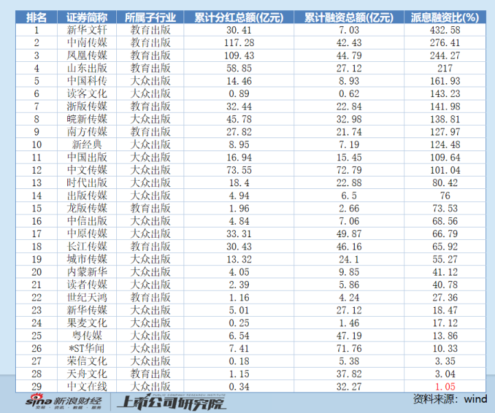 戒指现在,A股出书行业(申万二级行业分类)共有29家上市公司,累计融资总和706.09亿元,累计分成总和672.48亿元,平平分成融资比约为99.39%。其中,新汉文轩的分成融资比最高,达432.58%,约为行业平均水平的4倍;天舟文化虽位列倒数第二,但其分成融资比仍为中文在线的3倍,约为3.04%。