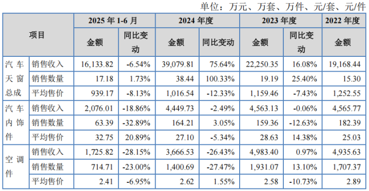 从募资用途来看,天运股份拟召募2.25亿元,其中1.15亿元用于汽车天窗及天幕扩产情势,3321.75万元用于车勤快能性新材料扩产情势,4685.12万元用于研发中心成立,3000万元补充流动资金。2024年天运股份汽车天窗总成产能诳骗率已达199.92%,处于严重超负荷景色,扩产大势所趋。但矛盾的是,2025年上半年天运股份汽车天窗收入为1.67亿元,同比下落6.54%,销量仅微增1.73%,而售价同比下落8.13%。在产能相等弥留的情况下,事迹反而出现下滑,这让新增产能的消化出息蒙上暗影。
