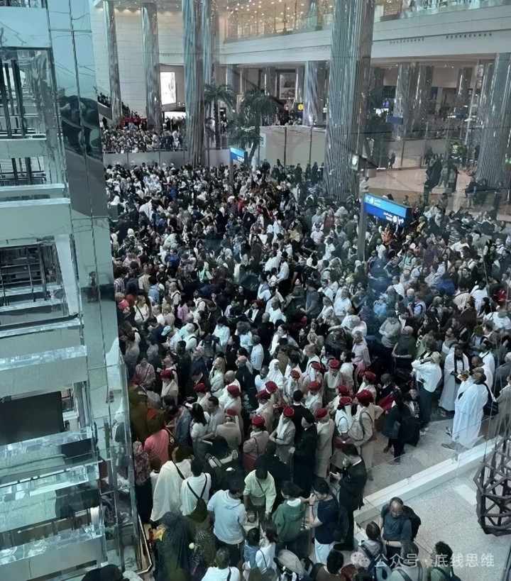 无数淹留在迪拜机场里的搭客,其中还能看到有阿联酋航空的机组