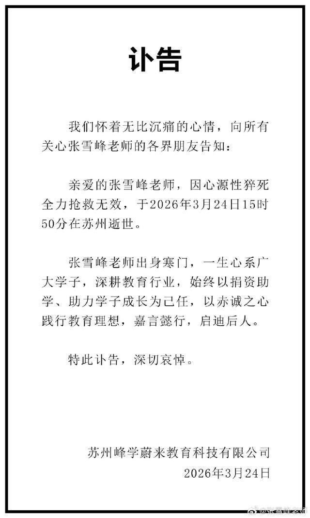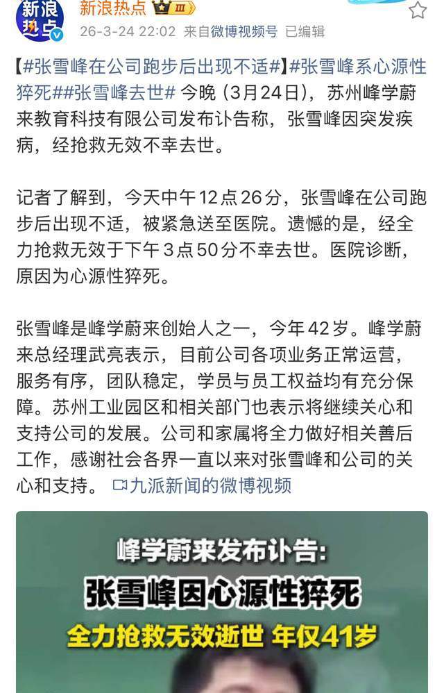 3月24号下昼,张雪峰被送往病院的音问不胫而走,当统共东说念主期待好音问的工夫,没思到夜晚传来恶耗,据其公司发布讣告音问称,张雪峰是因为心源性暴毙,不才午3点50分的工夫离开的。