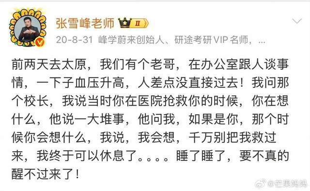 六年前波音体育官方网站,张雪峰曾共享动态,并表示我方的一位好年老升天了,为此他感叹我方要好好睡眠,要否则就醒不外来了,没思到这番话如今获得了印证。
