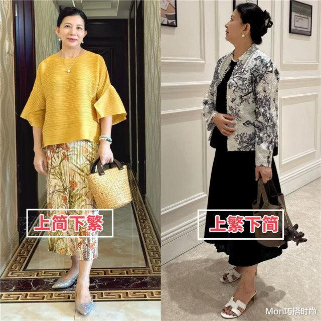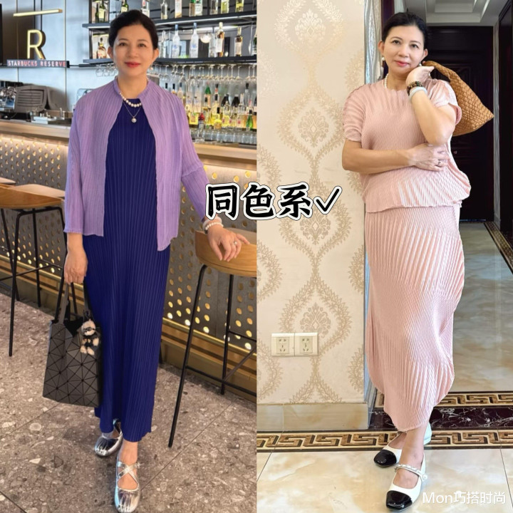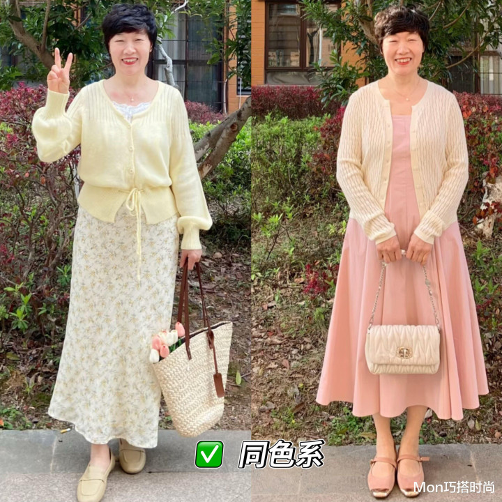 中年女东说念主要保抓年青小密斯那么苗条的躯壳太难了,我们没必要太尖刻我方,但我们不错靠穿搭来显瘦,比如穿裙子的时期,你不错搭配一件同色系的上衣简略外衣,让单品之间的色系相干度加深,趁势延迟我们的比例,幸免产生拖累感,这可比那些花里胡梢的撞色搭配更显瘦哦。