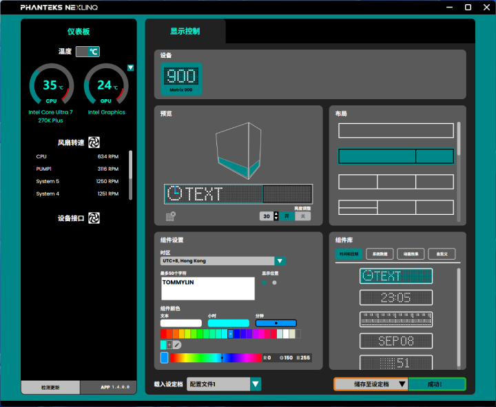 而其最具辨识度的想象,即是前脸与左侧面板的织物柔光LED矩阵屏,内置900颗LED灯珠,通过Nexlinq软件可结束分区独处适度,既能及时披露CPU、GPU的温度与转速,也能自界说翰墨、动画与时刻,且CPU资源占用低于3%,柔光织物材质灵验扩散光晕,幸免灯珠夺目,夜间使用也不会晃眼。
