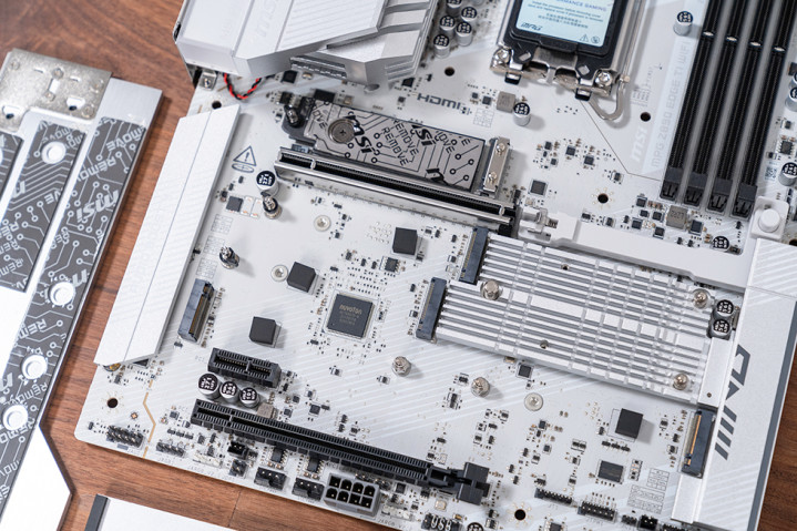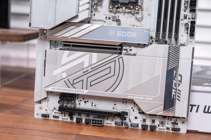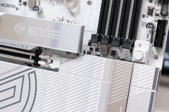 微星MPG Z890 EDGE TI WIFI刀锋钛主板提供了5个M.2槽位,并为其成立了全新第二代M.2冰霜铠甲。M.2_1和2槽位来自CPU直连,M.2_3、4、5槽位则由芯片组提供。其中M.2_1为PCIe 5.0 x4 模式,撑抓2280/2260规格,配备了独处的双面M.2 Shield Frozr II散热装甲。其他四个槽位均为PCIe 4.0 x4 模式,其中M.2_2、3撑抓2280/2260规格,M.2_4撑抓22110/2280规格,M.2_5撑抓 22110/2280/2260 规格。4个槽位分享一块大面积的M.2 Shield Frozr II散热装甲。