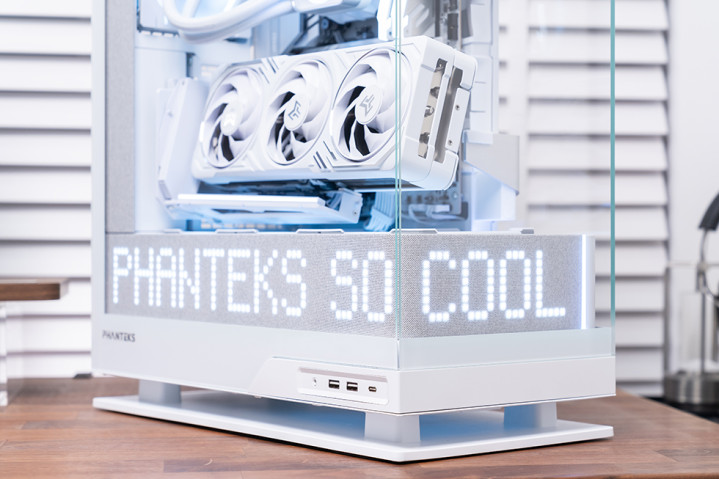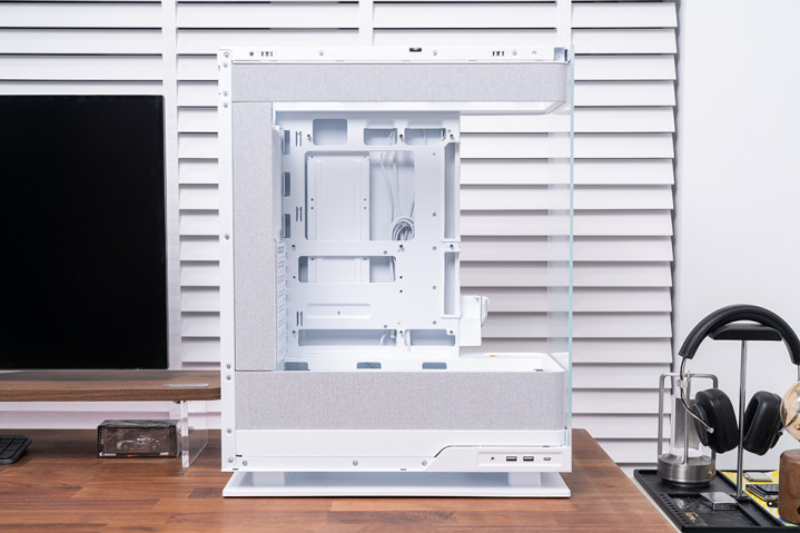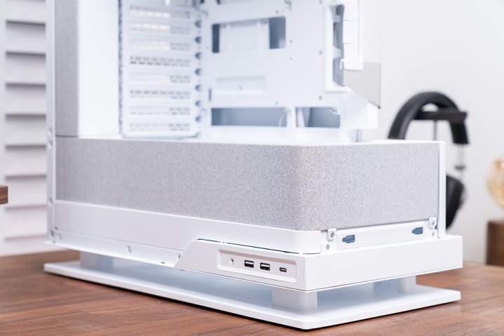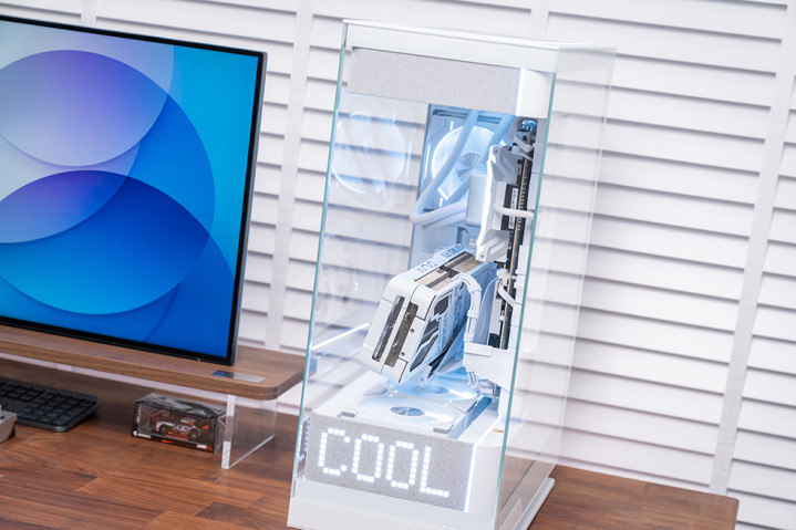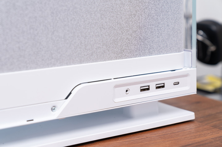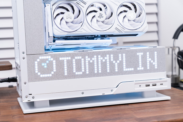 底部布局的1×USB3.2 Gen2x2 Type-C(20Gbps)、2×USB3.2 Gen1 Type-A接口以及顶部的音频接口、电源和重启键,搭配隐秘式理线仓与全覆盖背挡,让整机在视觉上更显整洁,270°环绕透视的三面玻璃,也让矩阵屏点亮后成为桌搭中的实足视觉焦点,兼顾了颜值与实用性。