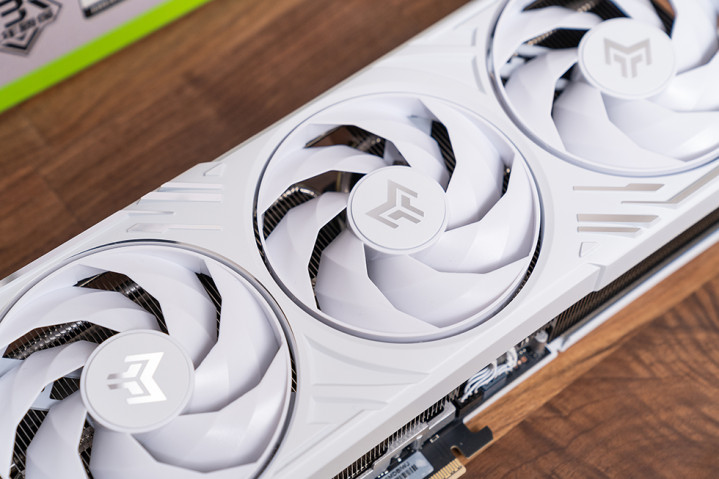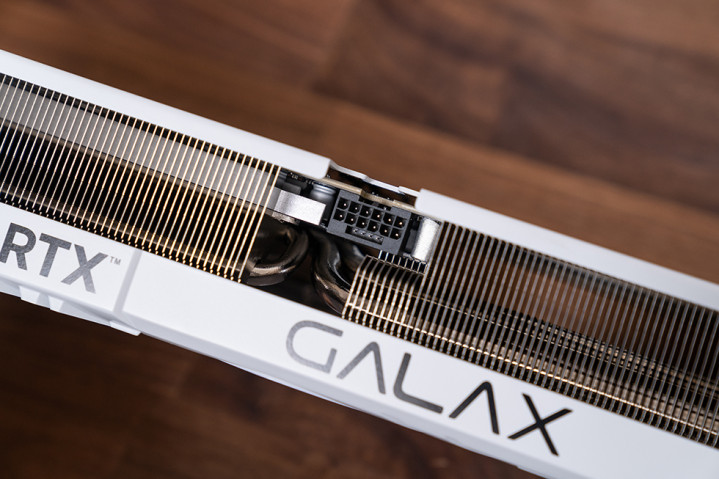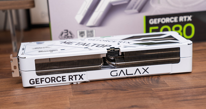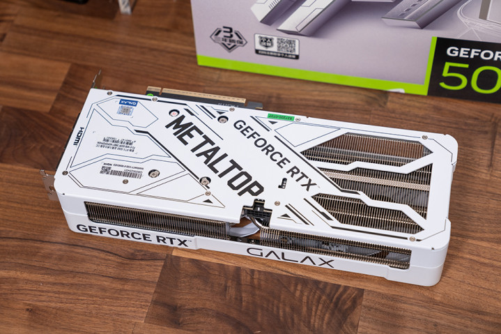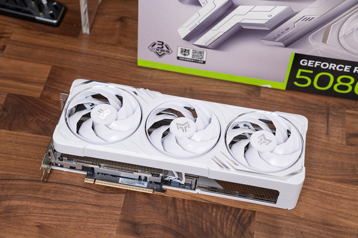 影驰 GeForce RTX 5080 金属内行 白金版 OC显卡厚约2.5槽,举座尺寸316.5*135.1*56mm(含挡板)。上盖延续铝合金一体压铸成型工艺,采取了全覆盖的想象,铝合金材质缓助散热,尾端以及侧面贯串开孔想象为散热提供更好的撑抓。顶部莫得异常的RGB灯效想象,只须GEFORCE RTX和GALAX的字样涂装。