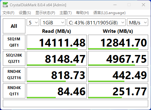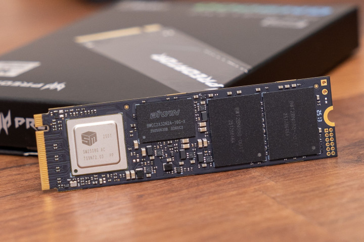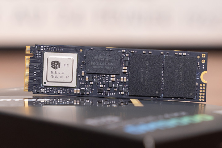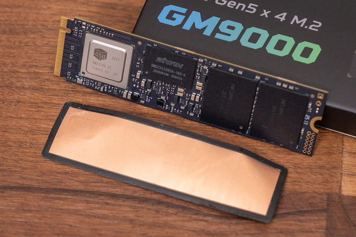 移革职义的铜箔石墨烯散热贴后不错看到正面的PCB围聚金手指的位置部署了慧荣科技的 SMI SM2508,手脚旗舰级 PCIe Gen5 固态硬盘主控,采取 6nm 制造工艺 ,撑抓 NVMe 2.0 合同,内建 8 个闪存通说念,最高撑抓 3600MT/s 的数据传输速率,或者结束高达 14.5GB/s 一语气读取和 14GB/s 的一语气写入速率。