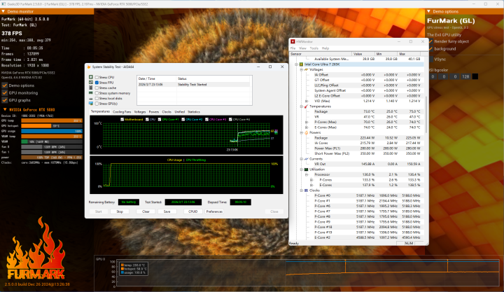 双烤温度测试,CPU 峰值功耗225W,最高温度75℃,显卡温度59℃。