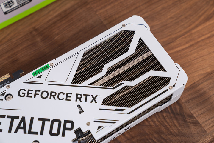 影驰 GeForce RTX 5080 金属内行 白金版 OC侧面的全金属装甲蔓延至背板,酿成360°包裹驻守。背板采取阳极氧化工艺,玄色“METALTOP”系列象征采取撞色涂装,周围环绕机甲格调浮雕纹路,充分强化视觉张力。右侧大面积的镂空,尾端半敞开想象,大风致平直穿透尾段的散热鳍片,灵验普及散热效率。