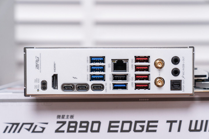 后置I/O区域采取了一模式I/O背板,提供了Clear CMOS按钮、Flash BIOS按钮、HDMI 2.1、2*Thunderbolt 4、1*USB Type-C 10Gbps、4*USB Type-A 5Gbps、1*USB 2.0、5G有线LAN、4*USB Type-A 10Gbps、Wi-Fi 7天线接口以及带S/PDIF输出的音频接口。