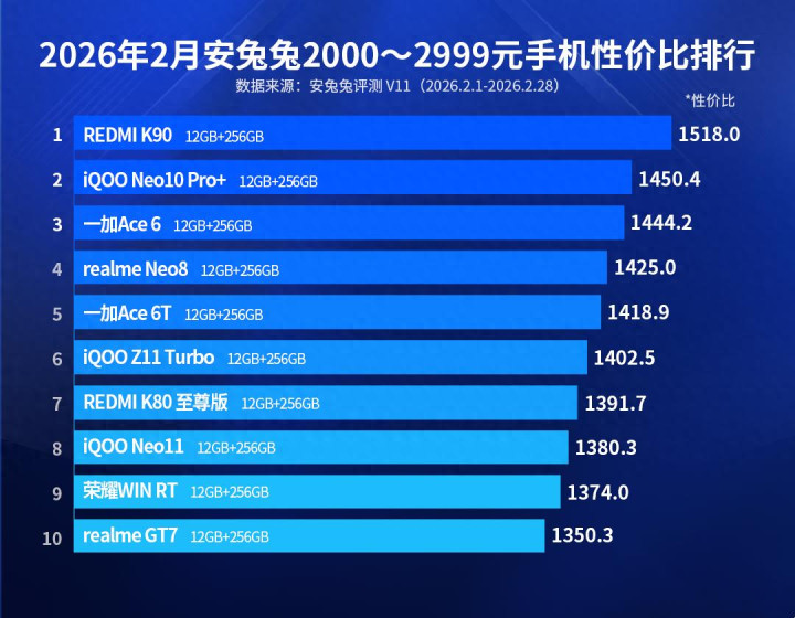 今天共享的是20206年2月安兔兔安卓中端手机性价比榜单,价钱区间为2000-2999元,它们齐是搭载次旗舰芯片的性高手机。要是凭据芯片分组的话,骁龙8Elite机型占了5款,骁龙8Gen5和天玑9400+分手占了3款和2款。其中客岁双11很火的红米K80至尊版仅排在第七名,第又名性价比值遥遥逾越,以下是此次榜单的小心实质。