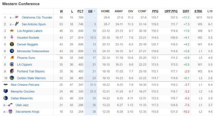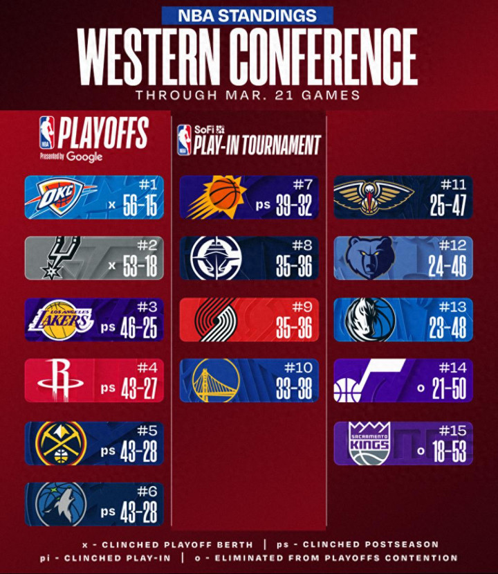 现在西部排行,1-6:雷霆、马刺(前二锁定季后赛)、湖东说念主、火箭、掘金、丛林狼;
