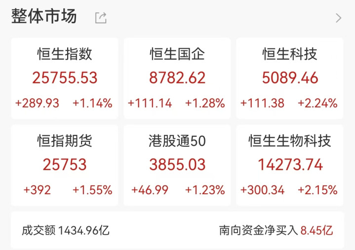 执法收盘,港股恒生指数涨1.14%,报25756.27点,恒生科技指数涨2.24%,报5089.53点,国企指数涨1.28%,报8782.74点,红筹指数跌0.84%,报4293.21点。