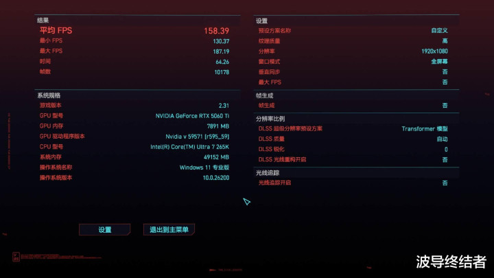 再来跑一下也曾的显卡杀手2077,在最新的2.31版块当中,仍是加入了对DLSS4和新模子的复古,径直在画面选项中切换即可。预设高画质,然后手动竖立开启DLSS4,关闭帧生成的情况下,跑得平均帧数158.39帧,最小FPS也有130.37帧,仍是是相等通顺了。一款游戏大致这样长久地优化以及出新内容(如昔日之影DLC),亦然难能贵重。