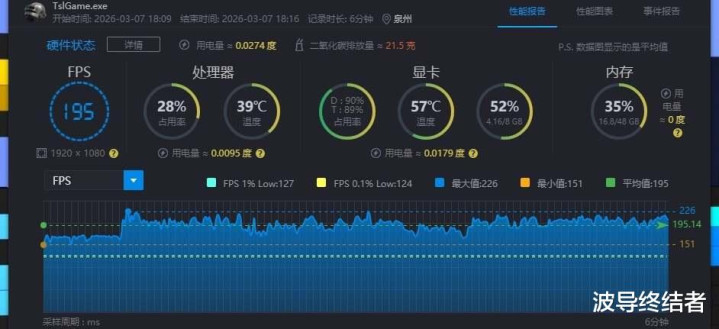 再来跑一下PUBG绝地求生,这样多年的握续优化下,吃鸡的发扬仍是是绝顶牢固了。最高画质预设下,平均帧率195帧,1%Low帧127,0.1%Low帧124,皆备无谓惦念帧数不稳影响刚枪。