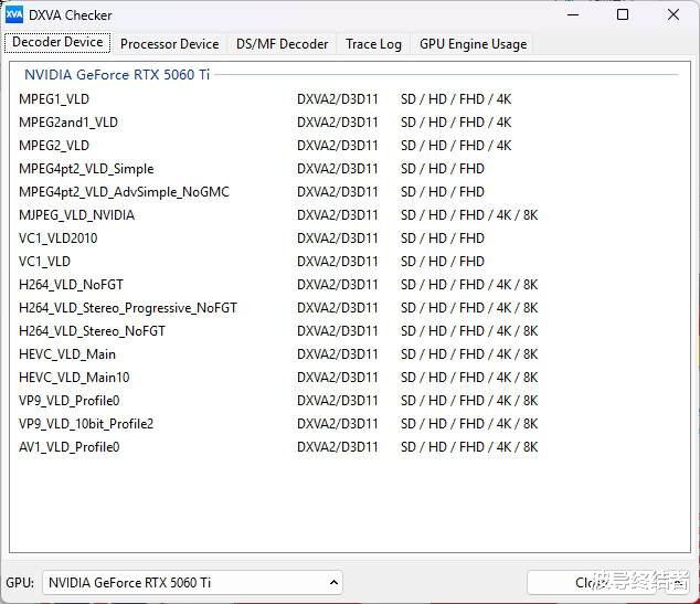 从DXVA Checker可以看到,5060Ti的硬件解码粉饰照旧绝顶全面的,从最早的MPEG1到MPEG4都有保留,而H264,HEVC(即H265),VP9,AV1也都复古。