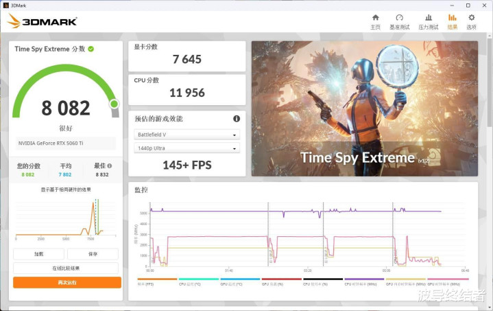 来到4K区别率的Time Spy Extreme名堂,概述得分8082分,显卡分数7645,3A大作降点殊效跑一下4K60照旧可以的,更别提开了DLSS之后了。