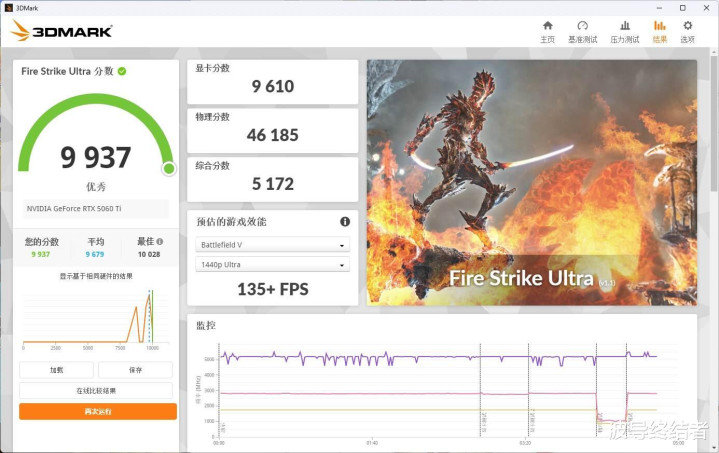 而4K区别率的Fire Strike Ultra中,概述得分9937,显卡得分9610分,非竞技游戏跑一下4K通顺照旧可以的。