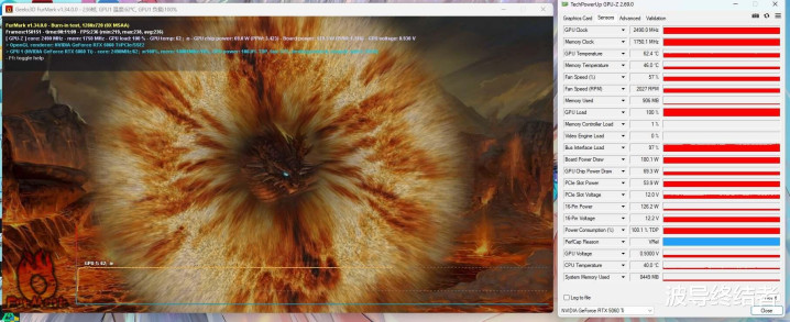 最后,再给这张技嘉5060Ti AERO OC烤个机吧。甜甜圈连气儿跑10多分钟,功率牢固在180W,中枢温度62.4度,电扇转速仅57%。这一代的能耗比如实很可以,发烧和杂音都压得绝顶低了。