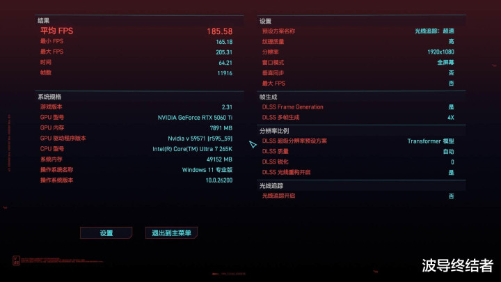 若是思享受更高的画面成果和帧率也肤浅,开启4X的DLSS多帧生成,然后画面有联想可以径直拉到顶,也等于最高的明后跟踪超速档位,DLSS明后重构开启,185.58的帧率亦然粗率畅玩了。