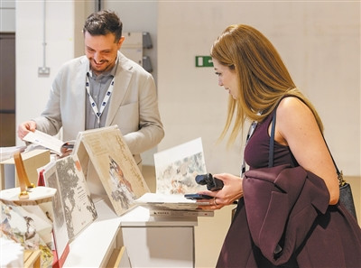 两名参展商在中国辘集展台翻阅《红楼梦》画册。